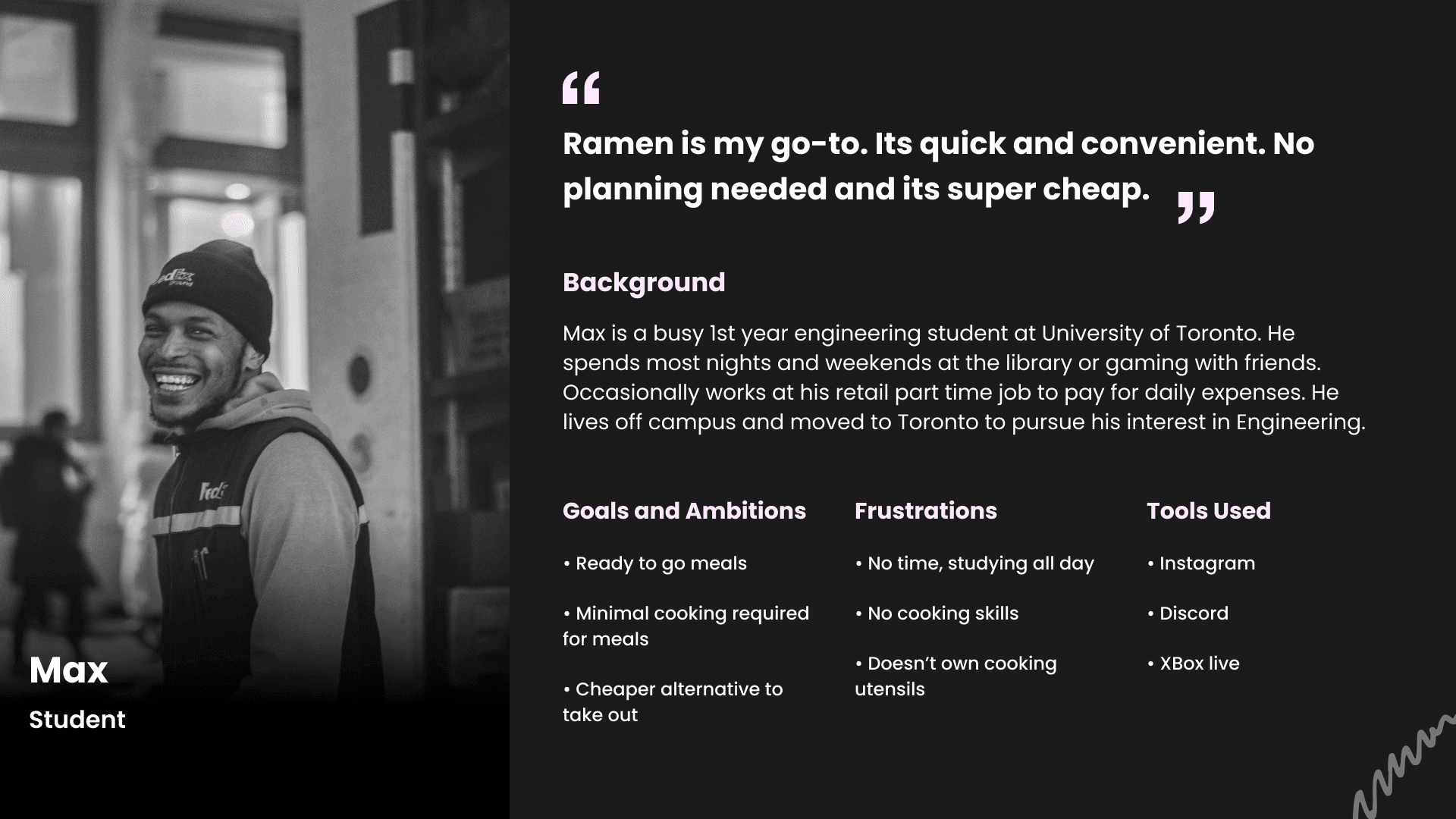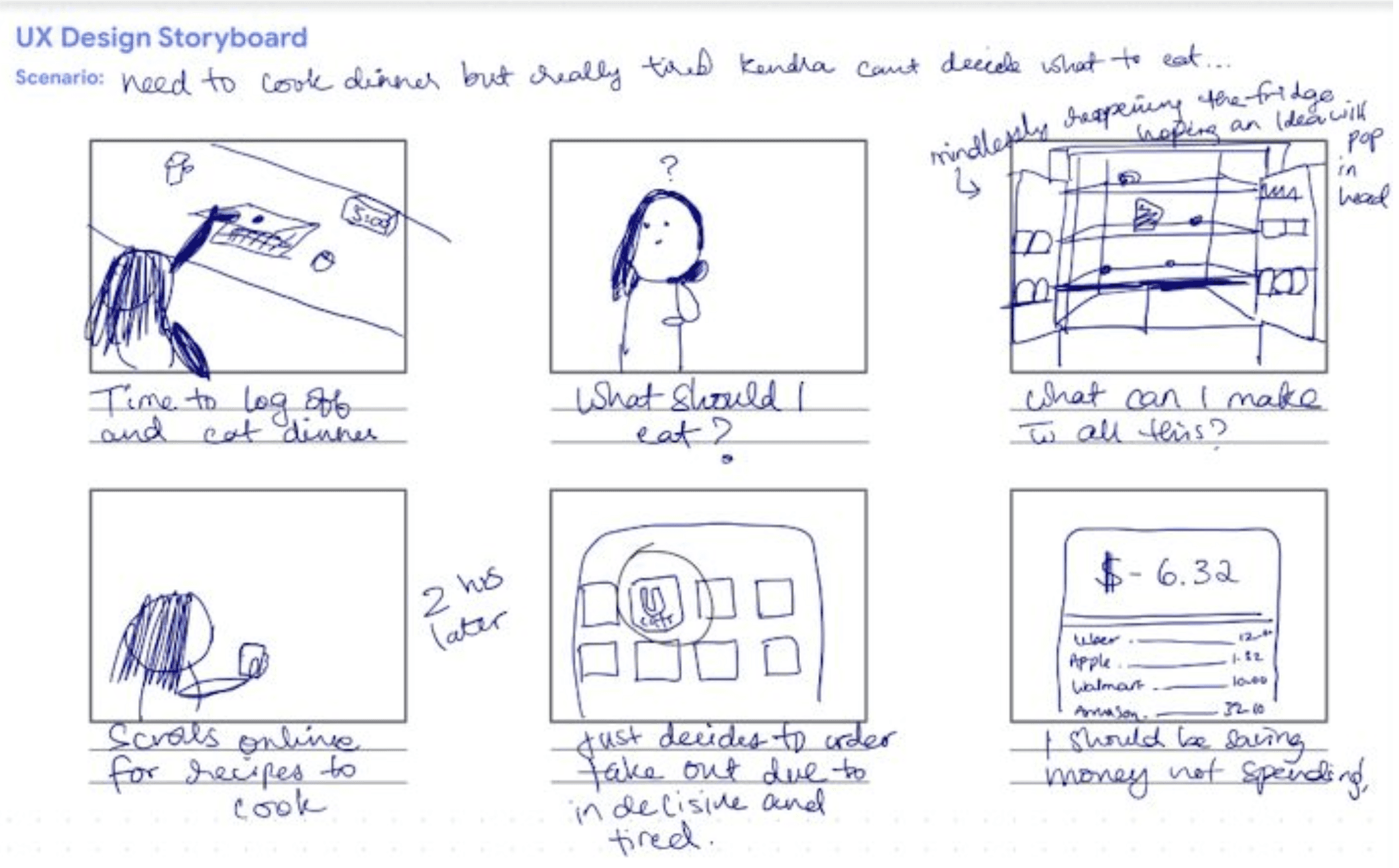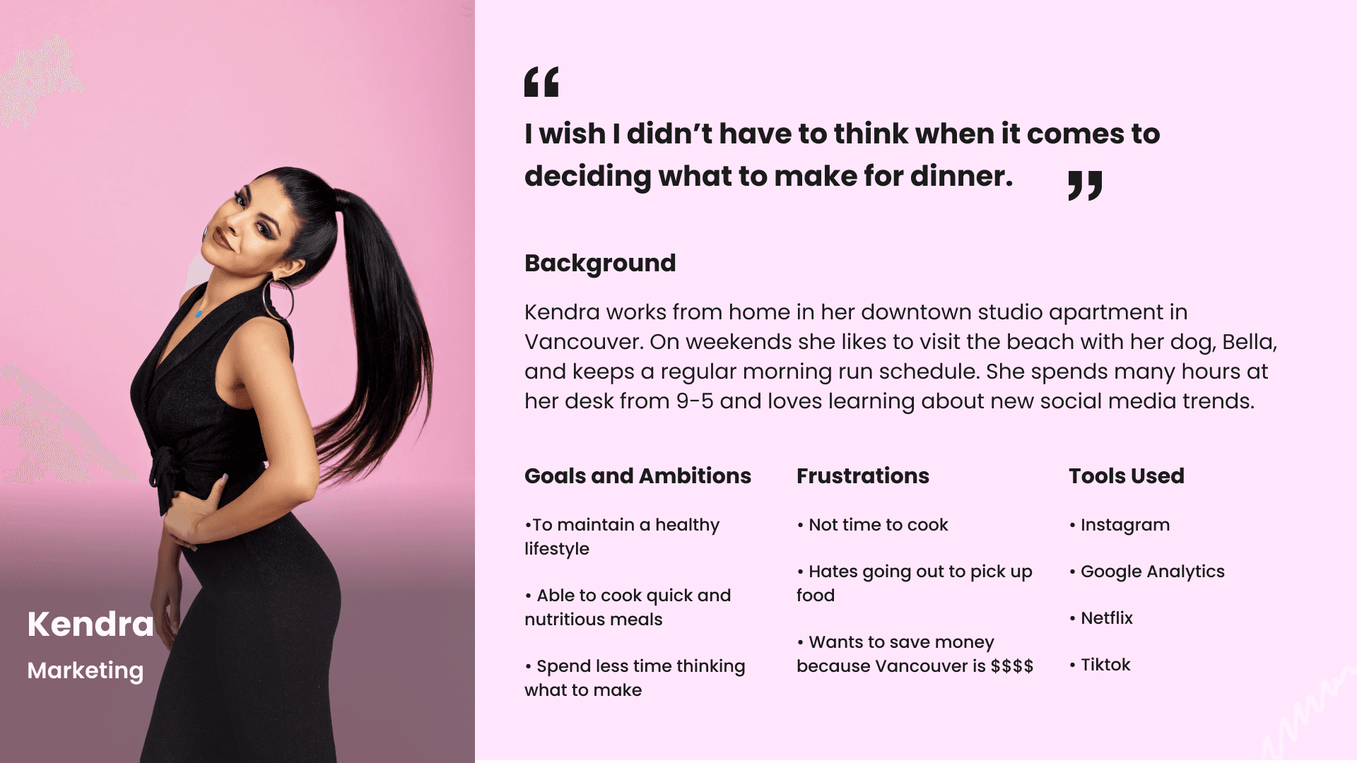 The persona represents the viewpoint of the user, Kendra, who struggles to create something after work hours due to exhaustion and ultimately opts for a more convenient option: ordering dinner from a food delivery app, even if her financial situation doesn't allow for it.