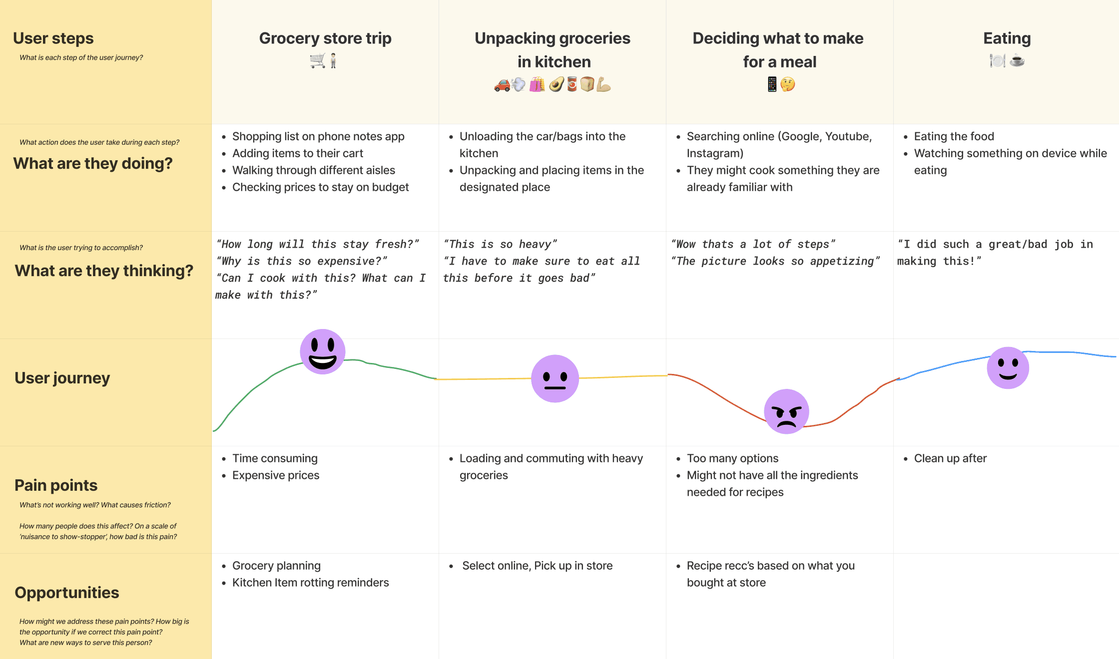 I developed a User Journey map illustrating a comprehensive perspective on the user's experience of visiting the grocery store, unloading purchased items, preparing a meal, and ultimately enjoying it.