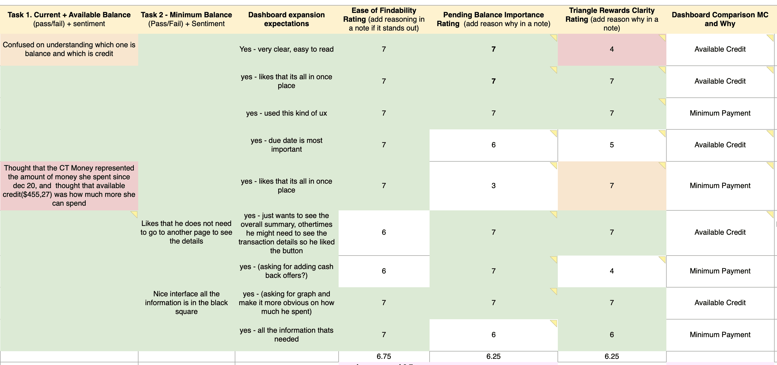 After analyzing the usability testing results, the primary objective of our study, which was to understand if customers prefer viewing "Available Credit" or "Minimum Payment" on the Triangle MasterCard app, was successfully met. The data indicated a clear user preference towards the 'Available Credit' version of the dashboard. Therefore, my recommendation to the Senior Designer was to proceed with the 'Available Credit Version', as this design choice aligns directly with the users' needs and preferences unearthed during our research.
