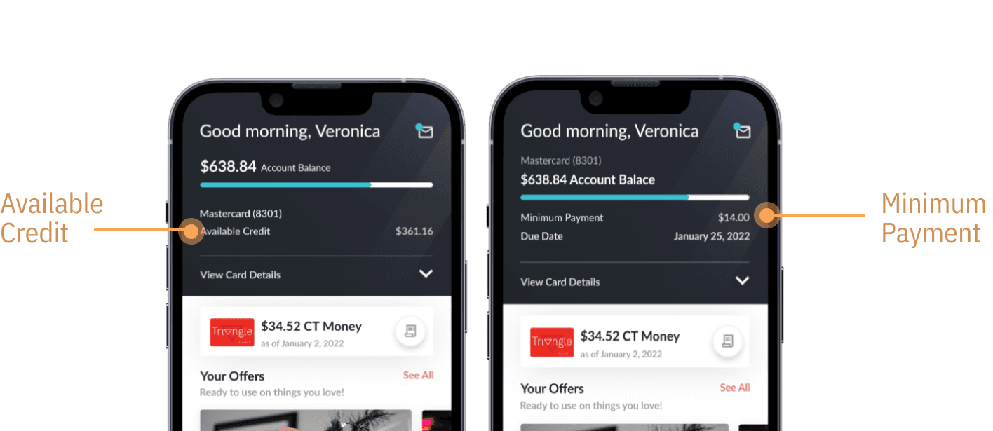 Show us where you would find your minimum monthly payment amount.Is this what you would expect when searching for more information on your credit card? Why or why not?Is there any important information missing? Please explain.Please rate how easy it was to locate additional information about your credit card (1- Very Difficult, 7 - Very Easy).How important is having the pending balance (transactions that are not processed yet) amount on the dashboard to you? (1 - Not at all Important, 7 - Very Important)How obvious is your Triangle Rewards balance? Please explain (1 - Not at all Clear, 7 - Very ClearYou’ve been shown two different versions of the credit card dashboard. What information is most important for you to see when you first open the app?a) Available Credit Versionb) Minimum Payment and Due Date Versionc) Other, please explain"
