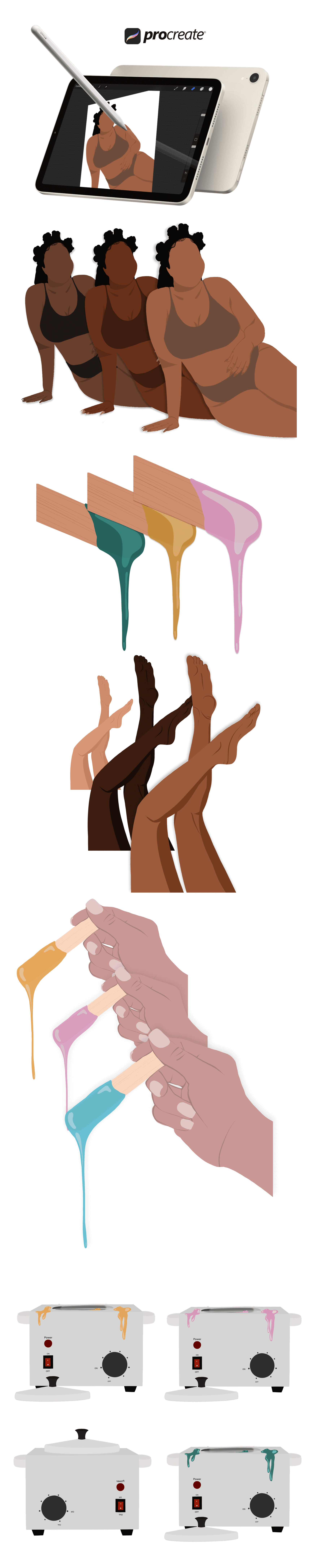 I designed some of the illustrations on Procreate with my iPad to have a personalized touch. I made sure to design illustrations that are inclusive and diverse to make it a welcoming business to all identifying women. Not only did I illustrate women, but other tools and resources associated with aesthetician such as wax melter and waxing strips, etc.